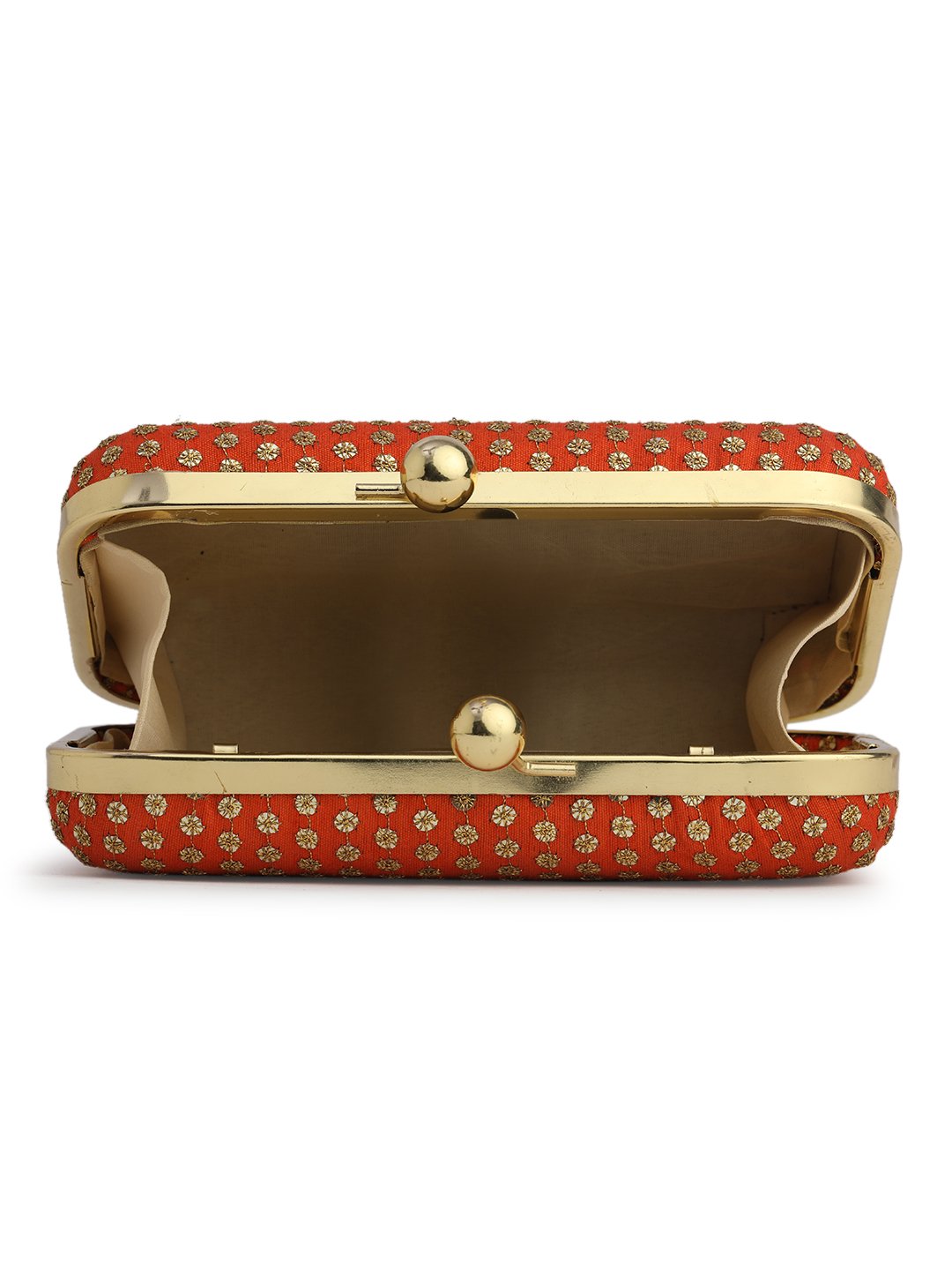 Orange & Gold Embroidered Box clutches, Has gold chain shoulder strap, 1 main compartment with Kiss closure